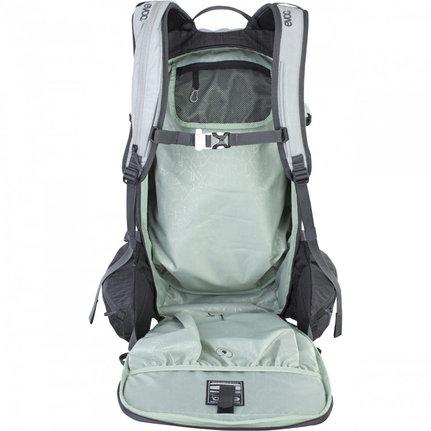 De belangrijkste kenmerken van de „Body Hugging“ fit van EVOC zijn de plaatsing van de rugzak zo dicht mogelijk bij het lichaam en de verdeling van het gewicht over een groot gebied op de heupen. Dankzij de geoptimaliseerde verbinding tussen de schouderbanden en de brede heupvinnen die uit het rugpand “groeien”, blijft de rugzak bij elke actie betrouwbaar in positie en zo stabiel mogelijk – voor meer comfort en controle.