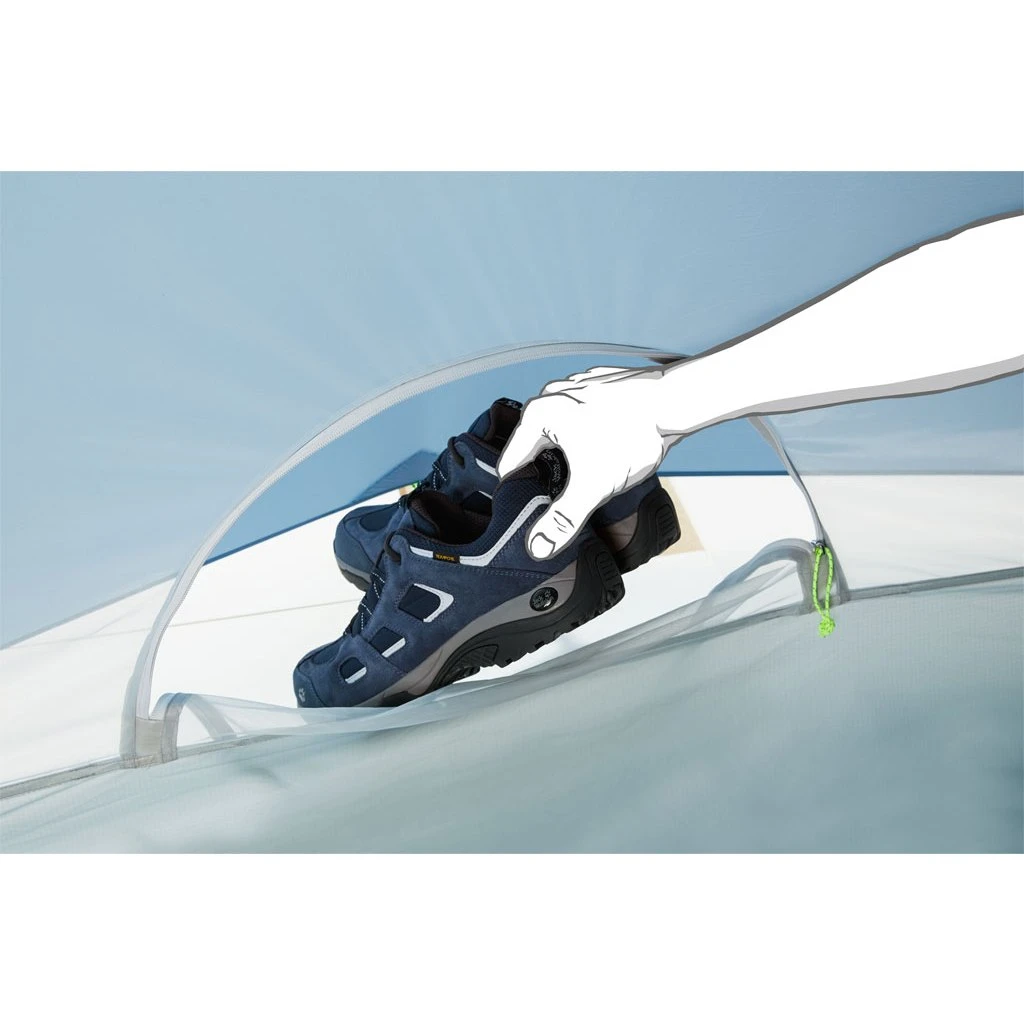 Tegenover de ingang is een kleine opening met rits waardoor u toegang heeft tot de kleinere vestibule. Hier kunt u bijvoorbeeld uw wandelschoenen opbergen, beschermd tegen de regen.