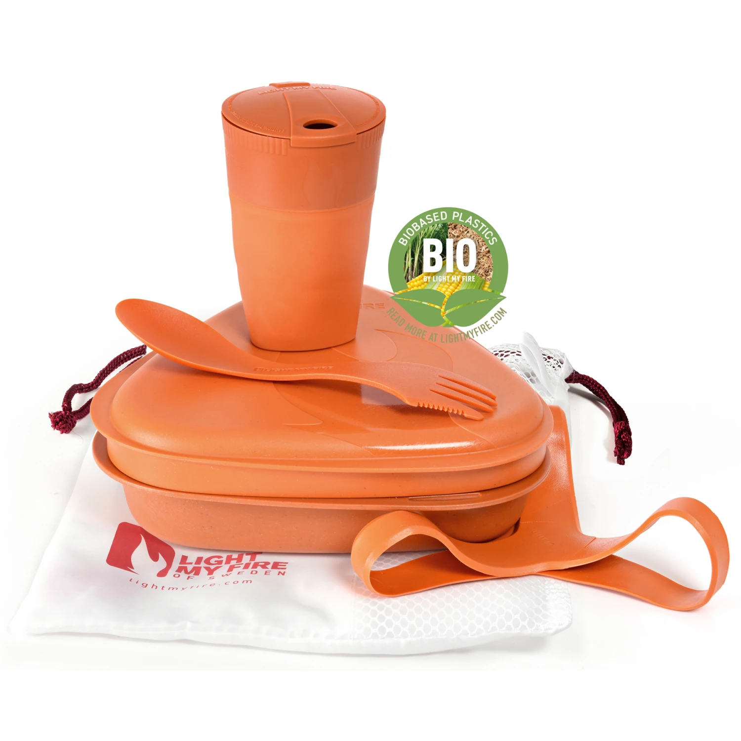Alles wat je nodig hebt om een maaltijd buitenshuis te bereiden en te eten. Netjes op elkaar gestapeld. De BIO meetset, speciaal ontworpen door de Scandinavische ontwerper Joachim Nordwall voor Light My Fire, is een praktisch alles-in-één servies. De kit bevat 1 deksel dat als bord fungeert (500 ml), 1 kom met diepe bodem die ook als bord kan worden gebruikt (900 ml), 1 verpakkingsbeker (260 ml) en 1 Light My Fire Spork Original. Het bevat ook een lint om de set bij elkaar te houden. De Pack-Up Cup trekt uit elkaar wanneer u klaar bent voor een warme of koude drank, en knijpt samen wanneer de maaltijd op is. Als het eten klaar is, kun je het bord en de kom gewoon gebruiken om een heerlijke maaltijd te eten met de Spork Original, een combinatie van lepel en vork en mes. Het mooie van deze set is dat alles in zichzelf kan worden gestapeld tot een compacte en veelzijdige eetset. Ten slotte zijn alle onderdelen vaatwasmachine- en magnetronbestendig (met uitzondering van de verpakkingsbeker) en gemaakt van bio-based plastic dat BPA-vrij is. Dit maakt de kit veelzijdig als lunchbox voor school of werk.