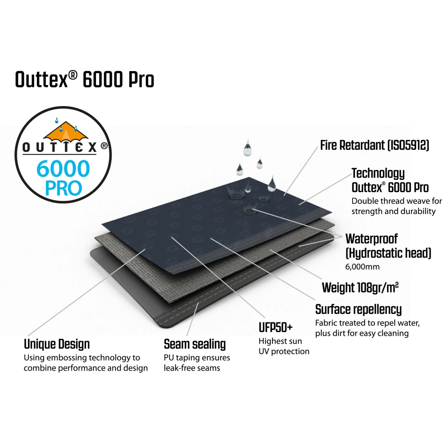 Outtex 6000 Pro is een hoogwaardig, supersterk en duurzaam 100% polyester, ontwikkeld voor onze luxere tentcollecties. Outtex 6000 Pro is perfect om het hele jaar door te kamperen, is brandvertragend en heeft een PU-coating die een waterkolom van 6.000 mm biedt.
