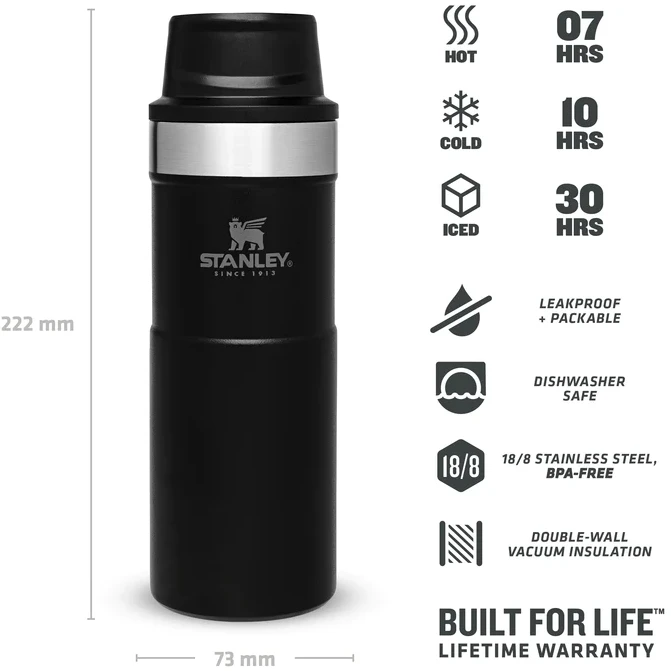 Met de introduceert Stanley een nieuwe generatie mokken die met één hand te bedienen zijn. Door met één hand op de grote en zeer soepele knop te drukken om de drinkopening te activeren, wordt drinken – onderweg – een plezier. De drinkbeker van 18/8 roestvrij staal met vacuümisolatie heeft een inhoud van 473 ml en houdt dranken tot 7 uur warm of zelfs 10 uur gekoeld. De TRIGGER-ACTION TRAVEL MUG past in de gebruikelijke houders voor autodrankjes.