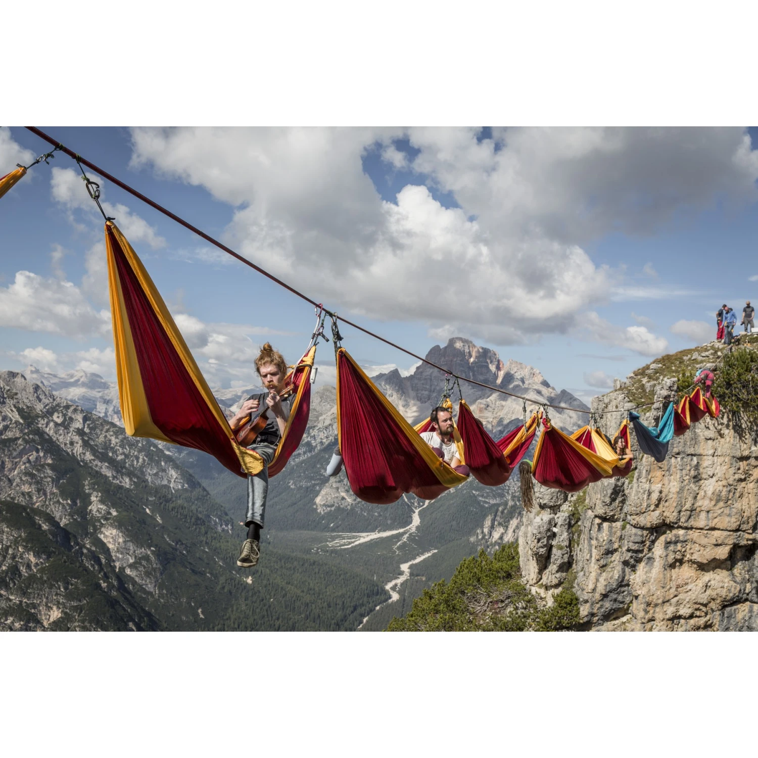 De populairste en best verkochte hangmat van Ticket To The Moon. In de 2 meter brede en kleurrijke alleskunner breng je hele nachten door op muziekfestivals, bij kampvuren, in de tuin of in het regenwoud. Met zijn drievoudige stiksels is de een ongelooflijk duurzame en betrouwbare metgezel. Als je de hangmat meeneemt op reis, kan hij zelfs worden gebruikt als nekrol of zitkussen. Het principe: “Van reizigers voor reizigers” staat met hoofdletters geschreven. In het zijvak kunnen zelfs sleutels, brillen enz. worden opgeborgen, zodat er niets verloren kan gaan.