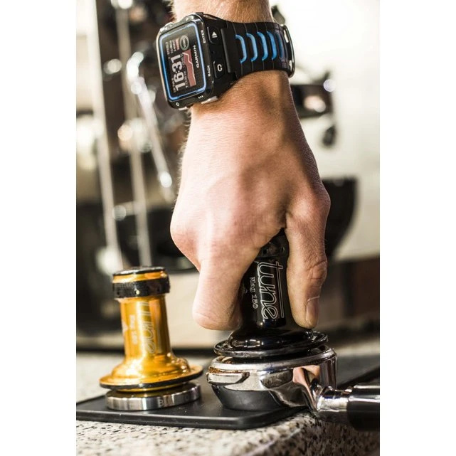 Net als bij de wielen van Tune is de focus van de roestvrijstalen tamper het naafhuis, omdat een origineel MAG150 naafhuis met carbon omwikkeling wordt gebruikt als tamperhandvat. De afdekkap is ook van carbon en wordt anders gebruikt op de GumGum Ahead expander, inclusief de zwart geanodiseerde aluminium schroef. De hoogwaardige, vlakke bodemplaat van roestvrij staal geeft de tamper een aangename zwaarte en zorgt voor een goede gewichtsverdeling. De diameter van de bodemplaat is iets groter dan 58 mm, waardoor er geen koffiedrab aan de rand van de zeef “onbedrukt” blijft en het water dus met constante druk door de koffie kan stromen.
